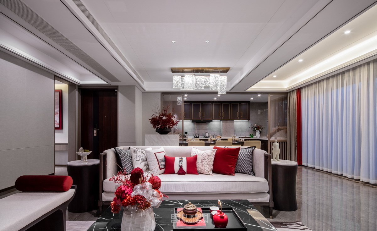 以沉稳大气的深木色作为硬装底色,配以实木、棉麻布艺、天然大理石,朱红色的陈设色调,空间元素紧扣当地潼南的地域文化,铺叙空间美学层次……