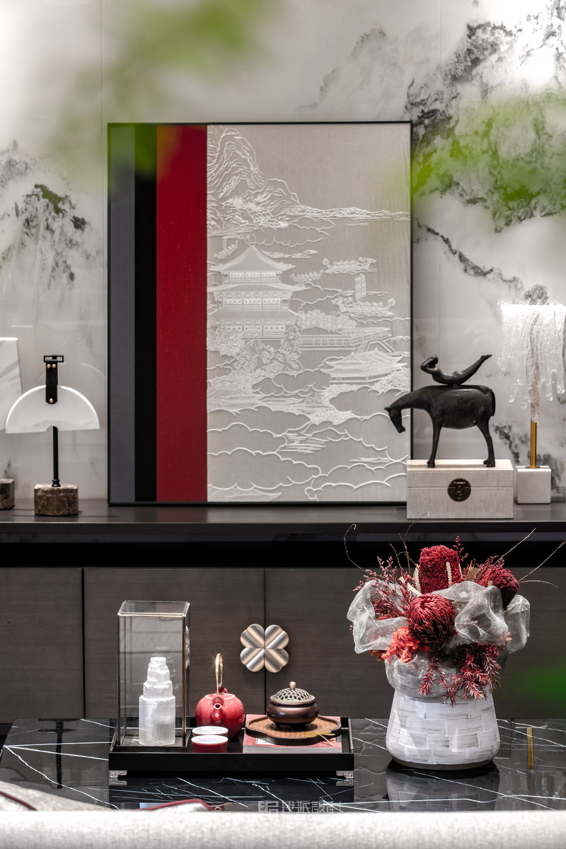 软装陈设设计中,本案整体在「现代东方」中尝试空间的诗意表达,兼具现代设计的艺术美感与静雅的中式韵味。