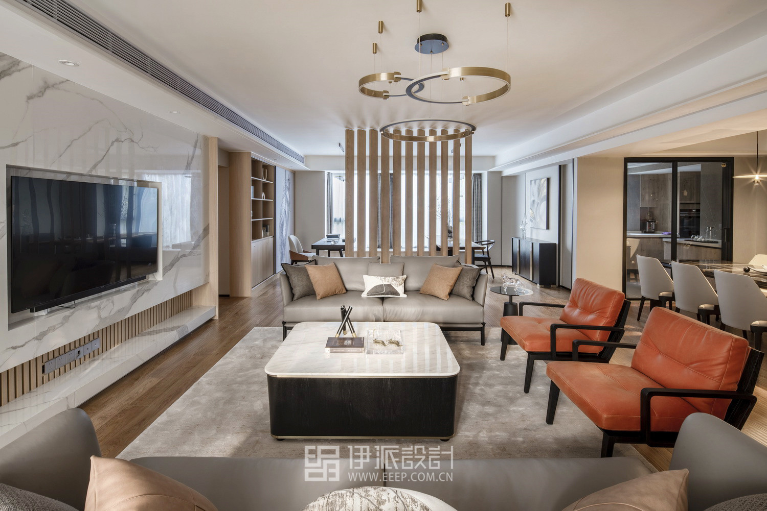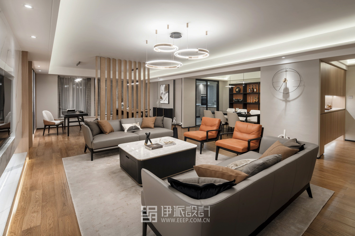 经过重新设计,伊派实施了从设计—工程—软装的一体化设计修整方案,房间从5室2厅改为2室4厅,在硬装方面,扩大客厅休闲阳台,弥补无落地窗的遗憾,采光得到弥补;规划宽敞的餐厨空间,同时扩大生活阳台,放置洗衣家政区,空间更为开阔,动线更为清晰。
