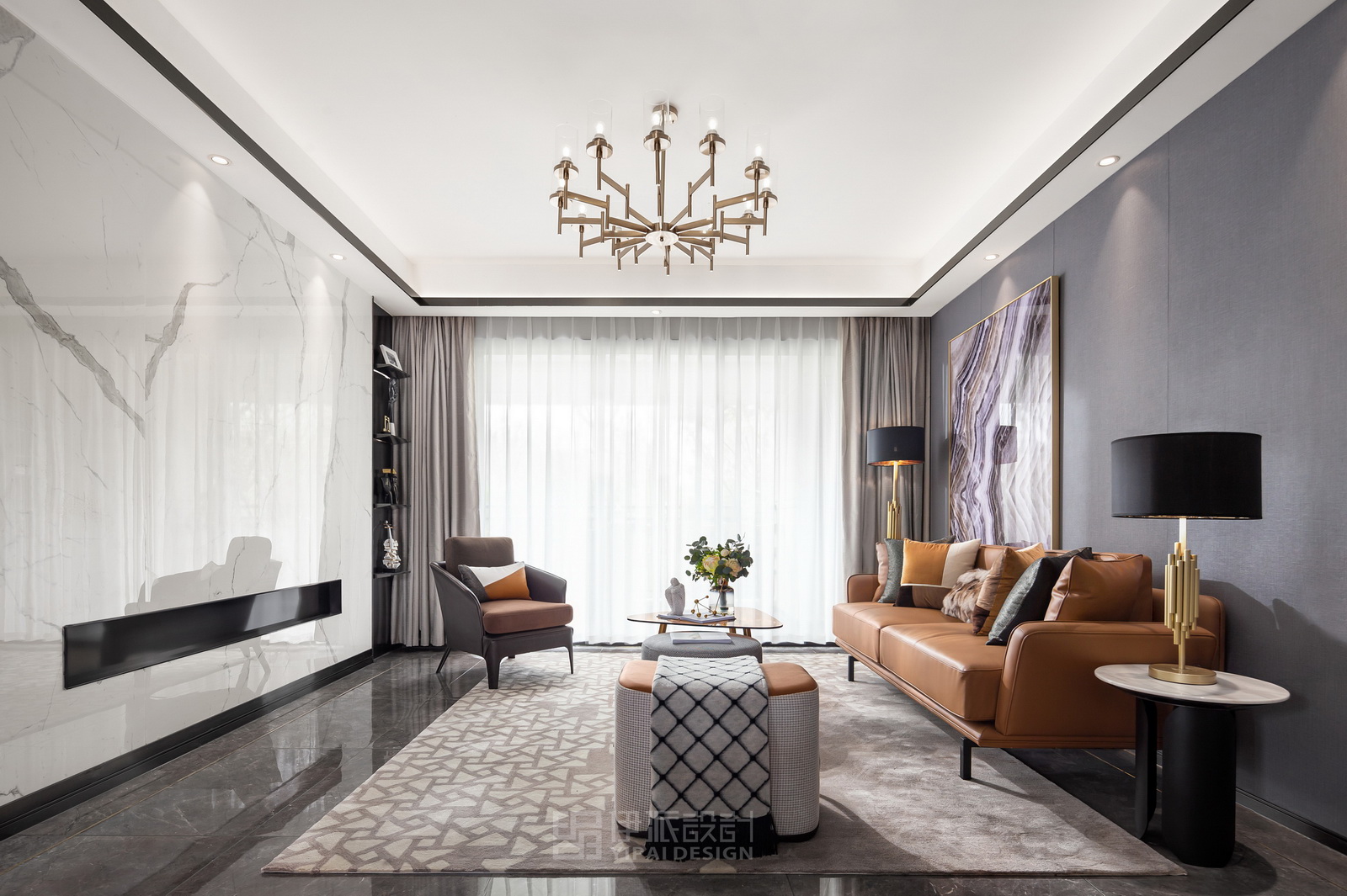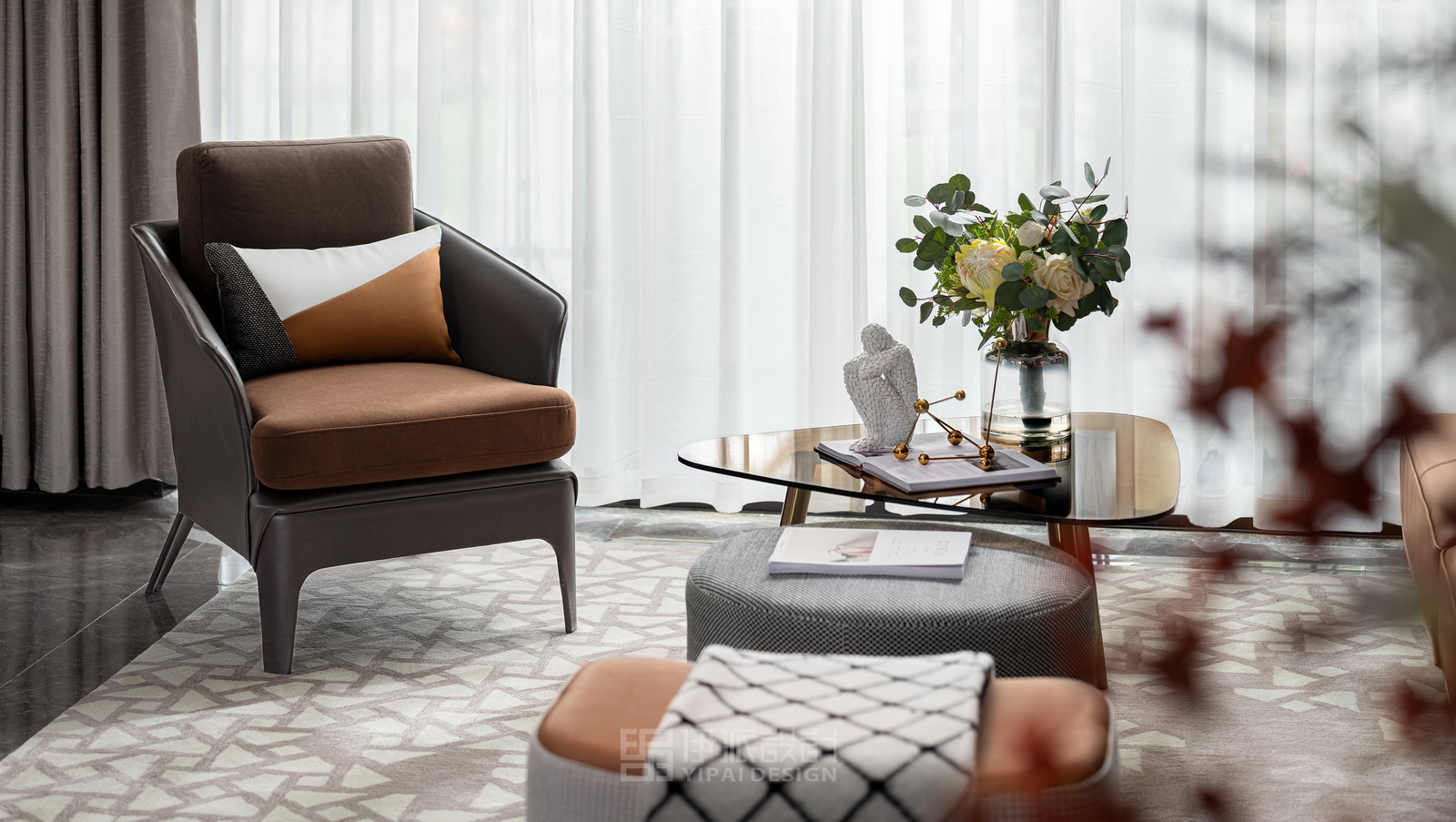 本案风格为现代港式风格,采用时尚精简、低调内敛的高级灰是用于家居装扮的首选基调色彩,呈现优雅魅力和精致大气的视觉感官,符合人们对现代生活的审美需求。同理,作为潮流都市代表色之一的暖橙,伊派设计在居家设计中的运用中,让空间张扬不浮夸、经典且时尚,成为永恒不变的奢侈品味。